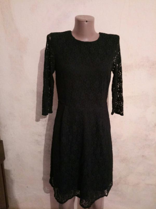 Гипюрова сукня чорного кольору, на підкладі, круглий виріз горловини з переходом у V-подібний на спинці, рукава 1\2, відрізне по лінії талії та призборено на гумку, на спідничній частині попереду з боків невелика складка, позаду по вирізу горловини зав'язується на стрічки, довжина сукні до коліна.