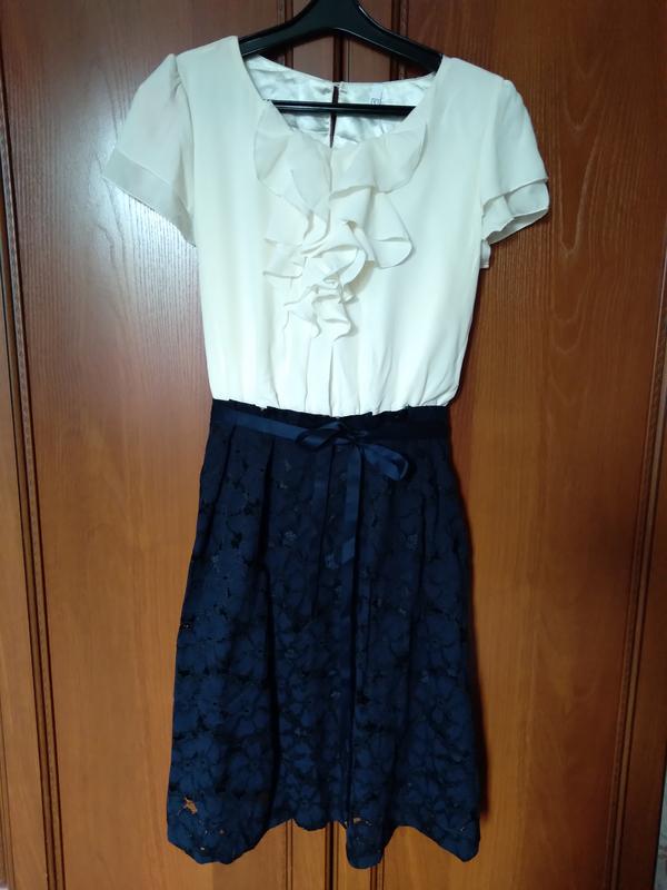Замеры на фото.Верх молочного цвета, низ темно синий.Ззади на шее пуговиц, сбоку на замочке.Тоненький пояс.Есть подюпник.
