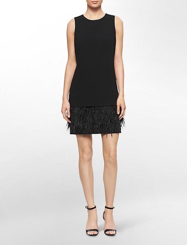 Платье-футляр Calvin Klein, оригинал, размер 2 (S) без рукавов со вставкой из страусовых перьев по низу. Надето было один раз, состояние нового. Покупала на фигуру: рост – 165см, объем груди - 84см, объем талии – 62см, объем бедер -92см.