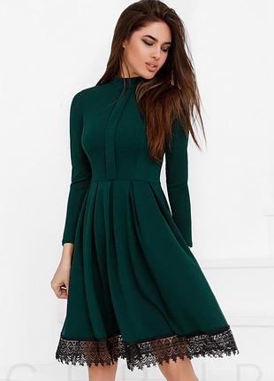 Аккуратное женское платье А-силуэта с коротким воротником-стойка, защипом-планкой на груди и пышной юбкой со складками, украшенной контрастным кружевом. общая длина 86 см. 90/70/ низ свободный. цвет изумрудный