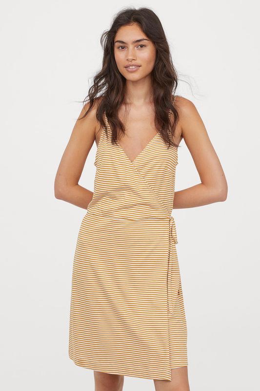 H&M платье на запахе в полоску. Разме по бирке М. Короткое платье без рукавов из мягкого слаб-трикотажа из модала с добавлением хлопка. Спереди и сзади треугольный вырез, а также пришитый запах. Отрезное по талии, слегка расклешенная юбка и пришитые завязки. Без подкладки. * СоставМодал 50%, Хлопок 50% Пог 48+ Талия 40 Бедра 51 Длина 89