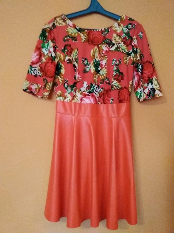 Платье с цветочным принтом и юбочкой из экокожи. Стилизованная под вышиванку. Полуобхват талии 36см, длина 86см.