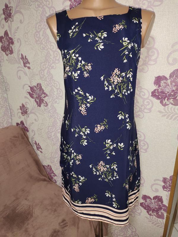 Красивое летнее платье тёмно-синего цвета в цветочек, свободный крой, застёгивается сзади на молнию, два кармана по бокам. Состав ткани 100 % вискоза. Замеры ПО груди 43 см., ПО талии 39 см., ПО бедер 47 см., длинна платья 86 см., ткань не тянется.