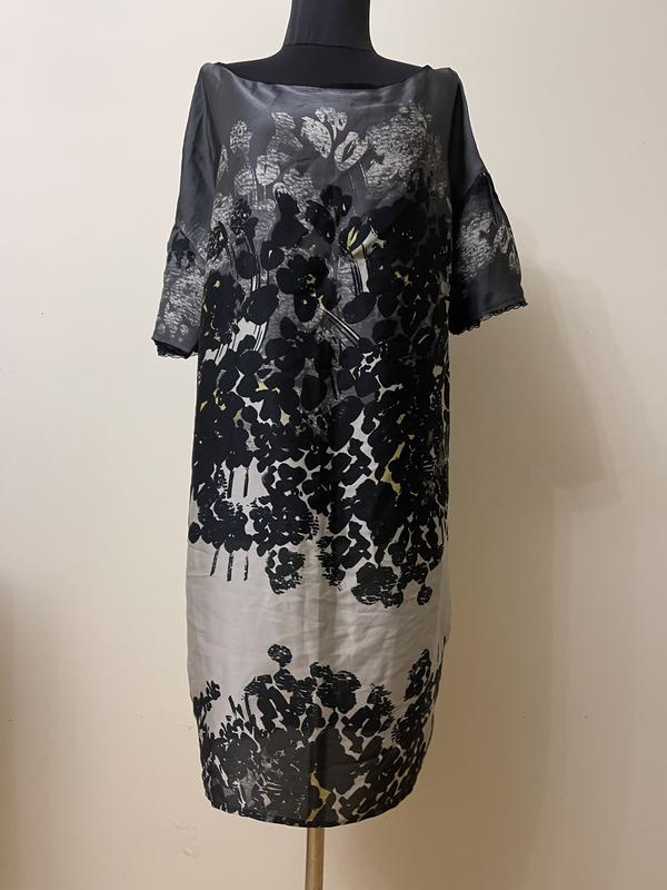 Сукня Twin Set, Simona Barbieri. ПОГ 52 см, ПОC 52 см, довжина 93 см. На спинці по всій довжині блискавка. Етикетка зрізана, на дотик шовк. Колір сірий з чорним і жовтим принтом. Стан нового. Сток. Дефектів немає.