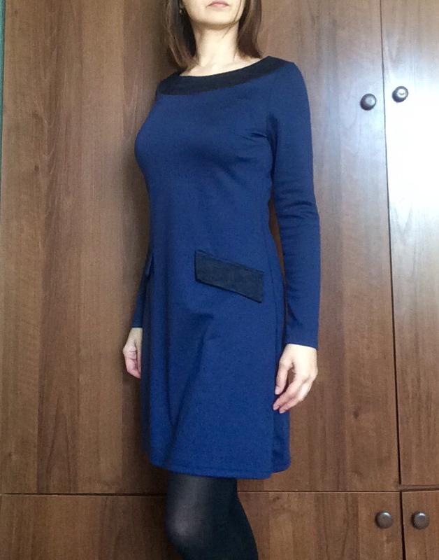 Розмір 44. Колір темно-синій, тканина-французький трикотаж (добре тягнеться), виміри в нерозтягнутому вигляді: ПОГ - 43 см., ПОТ - 80 см.,ПОБ - 47 см. Горловина та кишені оздоблені чорним мереживом . Довжина 85 см., довжина рукава 59 см. Сукня у відмінному стані.