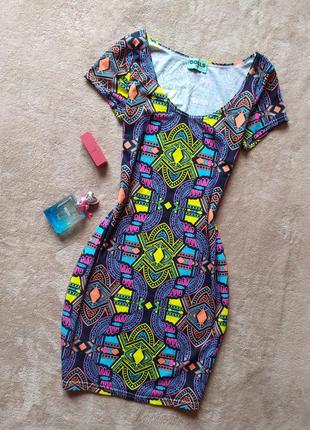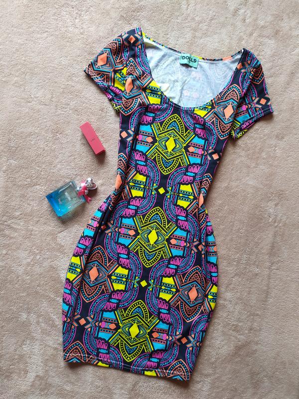 Яркое плотное мини платье в орнамент Dolls Paris 8 размер хорошо тянется и ложится по фигуре не просвечивает 95% полиэстер 5% эластан длина 85 см пог 40-50 см пот 33-43 см поб 43-53 см