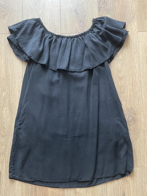 Платье zara открытые плечи воланы с рюшами свободного кроя черное серое джинс