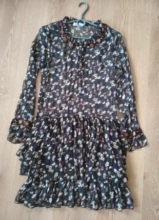 Шифоновое платьице с неброским цветочным принтом в стиле кантри. Актуально как под красовки,так и под босоножки, балетки. По горловине оригинальная отделка. Лёгкое,воздушное, очень приятное. Длина 90см, рукав 60, полуобхват 44.
