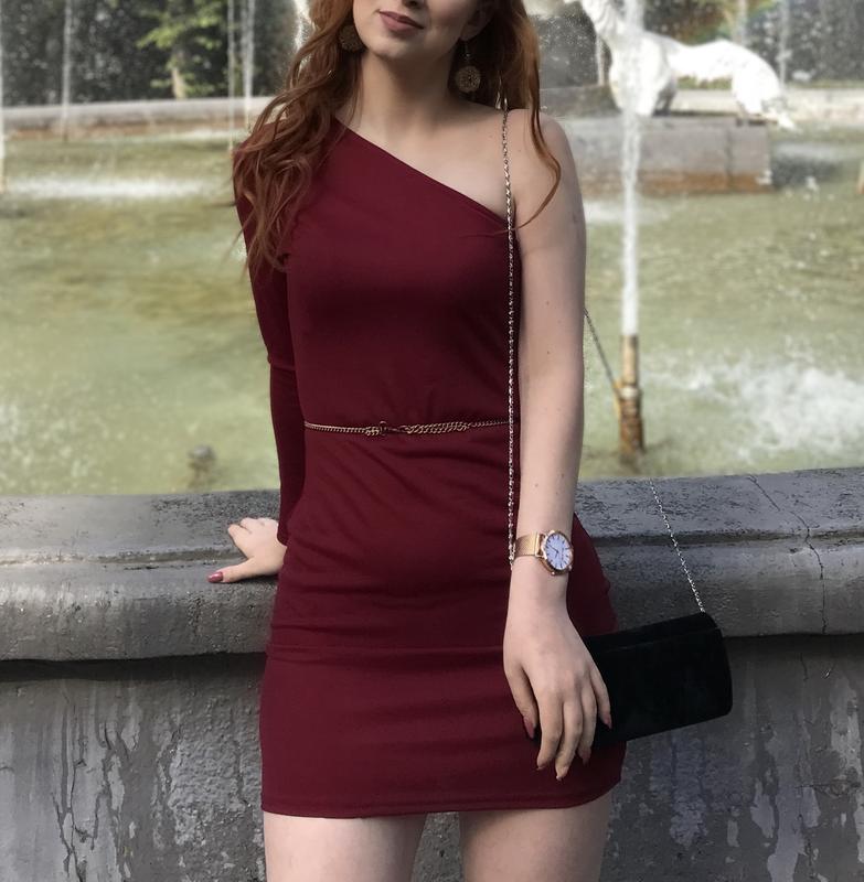 Міні-сукня на одне плече бордового кольору Бренду PrettyLittleThing p.Xs-S,може бути на невелику M. На фото одягнуто на параметри: Зріст 165 ОГ 87 ВІД 64 ПРО 94 Довжина 80 см