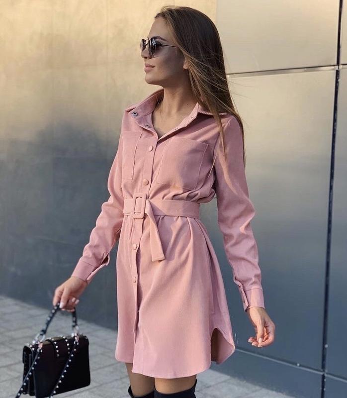 Платье рубашка, пояс в комплекте, пряжка обтянута тканью в цвет, кнопки как на фото в цвет платья. Ткань микровельвет