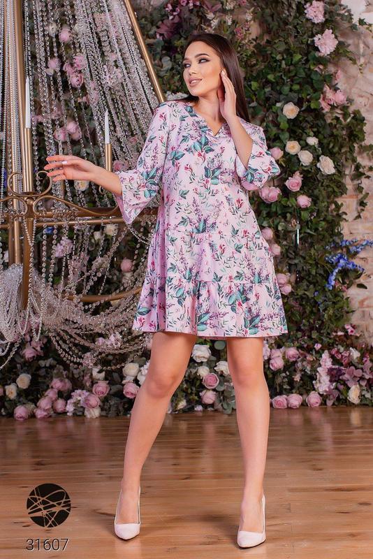 Сукня міні вільного крою. Фігурний виріз, рукава три чверті, нижня кромка з оборками. Колір: рожевий, голубий