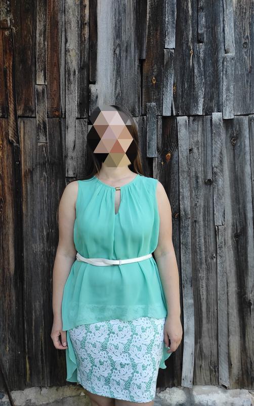 Довжина спереду - 84 см, ззаду 93 (шифон) Без замка, тканина добре тягнеться