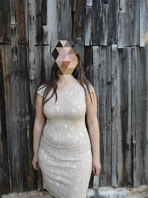 довжина 88 см тканина добре тягнеться ззаду, біля замка є 2 плямки, мало помітні, майже в колір плаття (на фото я показала)