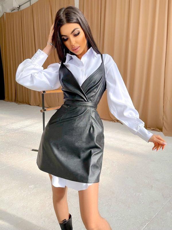 Платье-рубашка в комплекте с сарафаном из эко-кожи💣 ▫️ткань: креп-костюмка , эко-кожа ▫️размер: Универсальный S/M