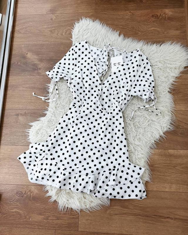 не бренд , производитель фабричный китай , работаем с безопасной оплатой ✅соблазнительное платье в горох с эффектом запаха с рюшами воланами открытая спинка ,замеров нет, их просто нереально сделать, размер единый - платье регулируется завязками,по бока м длина 80 см, длинна по спинке 88 см вырез не регулируется, но можно сверху закрепить брошкой или просто стижком .Платье не на запах, оно идёт с эффектом запаха, регулируется только вырез на спинке ( завязками) бёдра максимум 95 см