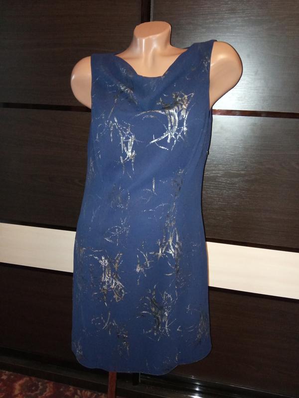 Инетесное платье, по всему платью золотисто-серебристый рисунок. Есть подкладка, под ручкой замочек. Рисунок немного стирается, но в носке не видно. ОГ 94 см ОТ 84 см ОБ 102 см Длина 83 см