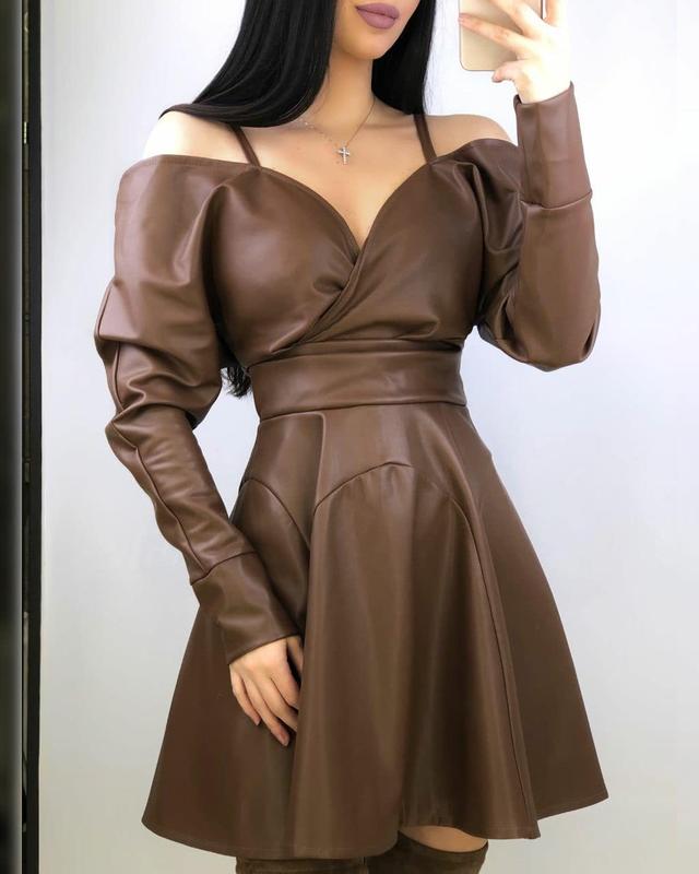 Материал платья эко-кожа на замше. Брители регулируются, верх платья на подкладке. Цвет молочный шоколад. Размер указан 44( пойдет на С-М).