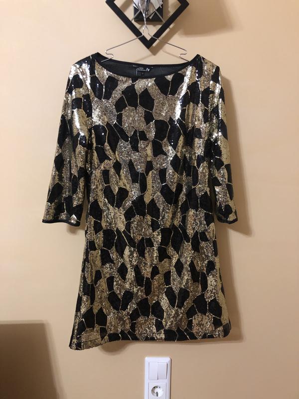 Сукня нова Колір золотий з чорним Вся у паєтках блискучих У грудях 88 тянеться до 92 Бедра вільні Довжина 81см Є підкладка Плаття дуже гарне Виглядає ефектно і дорого} Продаю тому що не підійшов розмір{так сама б носила