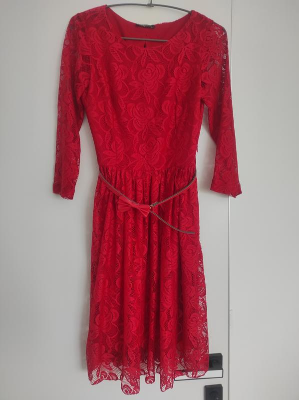 Симпатична яскрава сукня. Низ - підкладка, верх - кружево. Боковий замок. Спинка прикрашена бантиками. Рукав 3/4. Розмір - 36(S). Довжина сукні - 95 см (підкладка трошки коротша). ПОГ - 43см, ПОТ - 32 см. В комплекті є поясок зі шкірзамінника (ньюанс на фото).