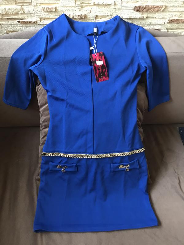 Короткое платье ярко-синего цвета рукав 3/4. По 22ке размер М, но подойдет на С. Длина 79 см, в талии 33 см, ширина под руками 40 см.