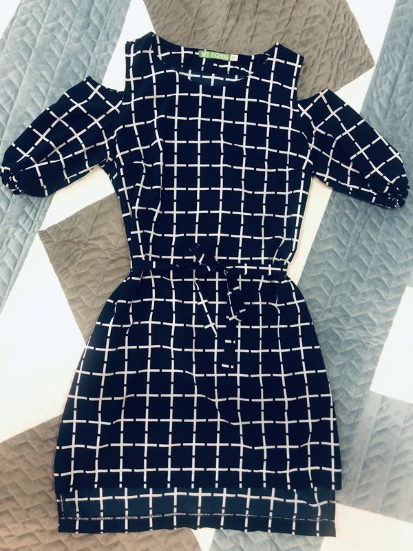 Синее платье в клетку, на пояске, сзади удлиненное! Состояние идеальное, размер на бирке М, плечи открытые, рукав на резинке