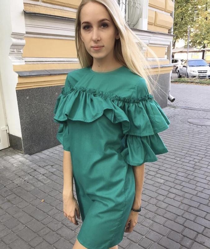 Бирюзовое платье с рюшами. Очень легкое и качественное.