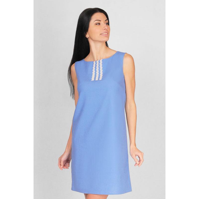 Модное летнее льняное платье голубого цвета, трапециевидного силуэта с вырезом горловины лодочка", без рукава. Перёд и спинка цельные. По центру спинки небольшой разрез для застежки. Застёжка-навесная петля с пуговицей. Перед украшен кружевом.