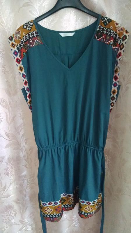 Платье свободного фасона с этно мотивами, с напуском на талию, по линии талии идет резинка, имеются шлевки для пояса и сам поясок, юбка с подкладкой. Декорировано бисером. Есть маленький устраняемый ньюанс, видно на фото, на плече отсутствует часть бисера. ► Ткань 100% полиэстер, похожа на шелк,не сминается. ► Размер 42. От плеча до талии 51,5 см От талии к низу 41 см В талии тянется до 54 см ПоБ 62 см ПоГ 54 см