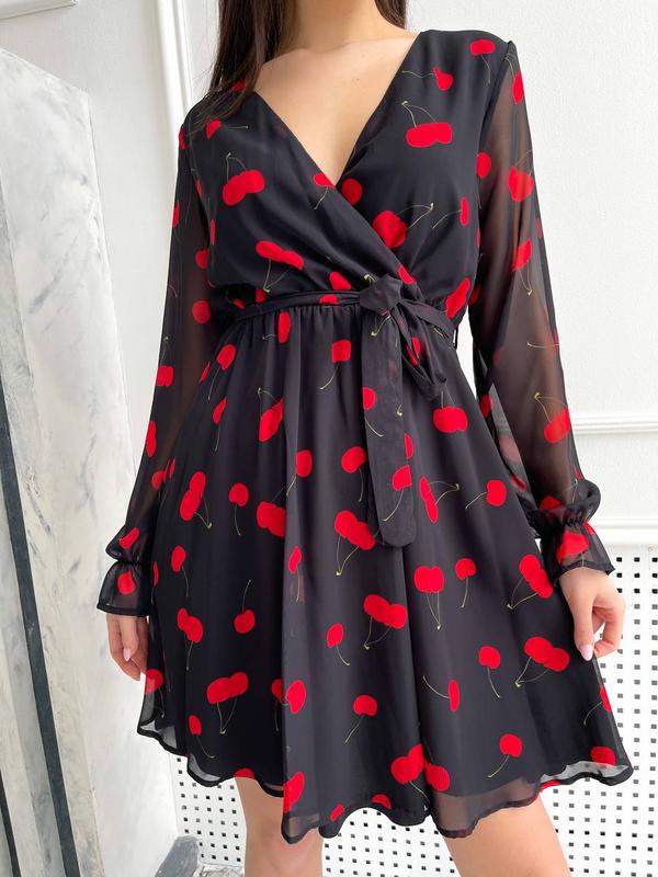 Сукня з вишеньками❣️ Розмір: s,m,l,xl Тканина: шифон на підкладці Довжина 90см