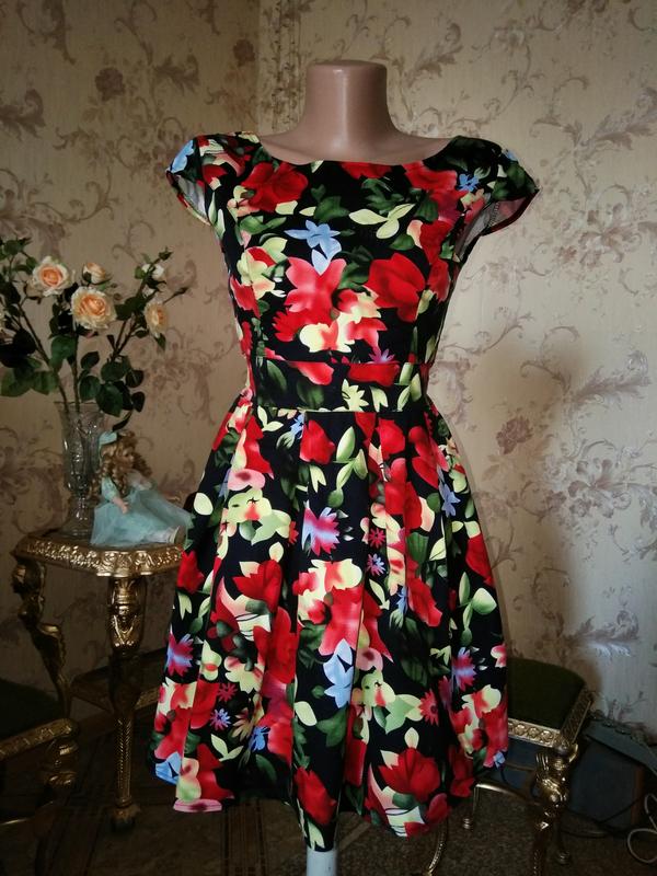 В идеальном состоянии. На размер 44, можно 44-46. Хлопок, эластан. Платье шитое, без бирки. Длина 79, пог 43-45 немножко тянется., по линии пояска 35-38, сзади молния.