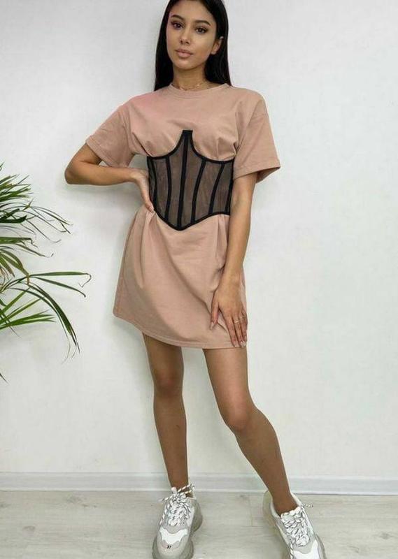 Платье - футболка + корсет Мод.138 СО Размер 42-46 (oversize) Ткань хлопок 100%, корсет - сетка с косточками, держит форму. (В продаже без цепочки) Цвет черный, молоко и беж. Базовое платье, которое пригодится вам в любое время года и в любой ситуации. Его можно обыграть под свой стиль , обувью и аксессуарами. Накинуть сверху любимый бомбер или косуху, Одеть под ботинки и под кроссовки.