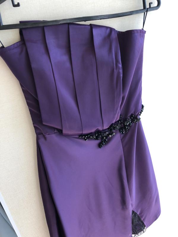 Продам очень нарядное вечернее платье. Пошито из плотного фиолетового атласа. Украшено камнями чёрного цвета, очень переливаются на солнце. Внизу имитация разреза украшена чёрным блестящим кружевом. Отрезной верх, без бретелей, потайная молния. Пошито на заказ. В отличном состоянии.Единственный нюанс пятнышко возле разреза(на фото), отстирывать не пробовала. Длина платья 74см, полуобхват талии 32см, бёдер 39см, грудь 35см. Размер S.