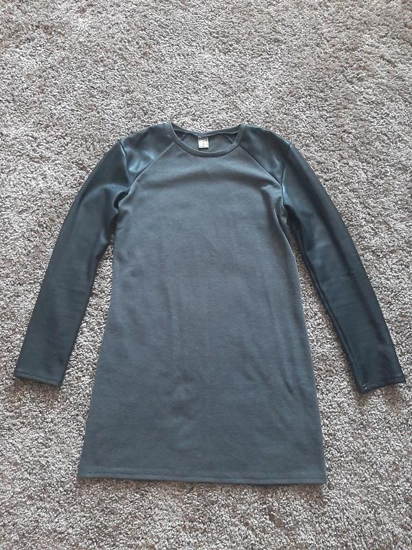 Коротеньке плаття в хорошому стані, вільного крою з кожаними рукавами. Довжина 80, ПОГ 44, ПОТ 44, довжина рукава 58.