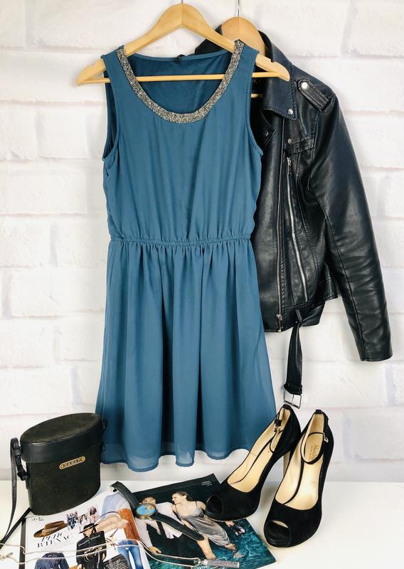 Очень красивое, легкое платье- сарафан с красивой отделкой бисером по горловине. На талии резинка, с подкладкой. Длина 88 см ПОГ 46 см ПОТ 32-42 см ПОБ 57 см