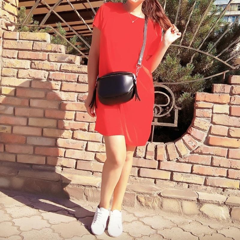 Отличное платье свободного кроя с молнией по спинке. Ткань средней плотности, хорошо лежит, не светит. Длина 90, ширина подмышками 50. На главном фото одето на размер M, по бирке L.