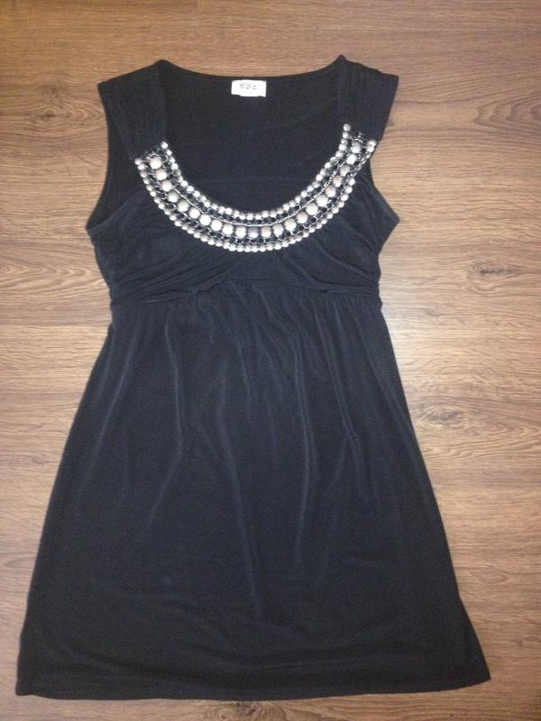 Плаття чорного кольору з прикрасою вільного покрою. Довжина 83 см, підмишки 50 см, талія 32 см.