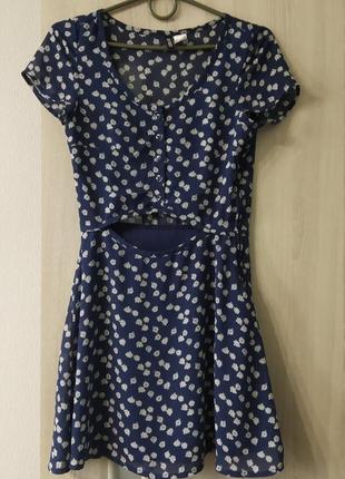 Летнее платье H&M ромашки. Темно - синее летнее платье. Короткое платье на пуговицах. Застёжка молния с боку. Размер 34, полиэстер. Платье на подкладке, не просвечивает.