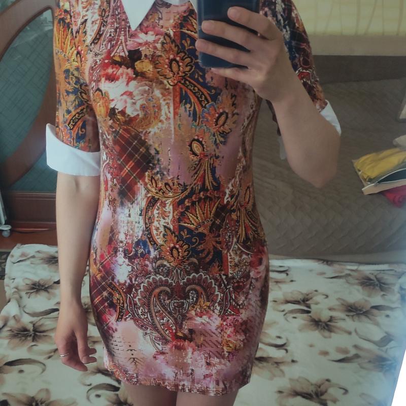 Короткое платье с контрасным воротничком и манжетами. Эластичная ткань, приятная к телу.