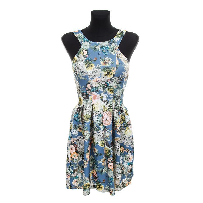 Стильное неопреновое платье размера M. Длина изделия - 86 см. Ширина пояса - 31 см. Хорошо тянется. Нежного голубого цвета с цветочным принтом.