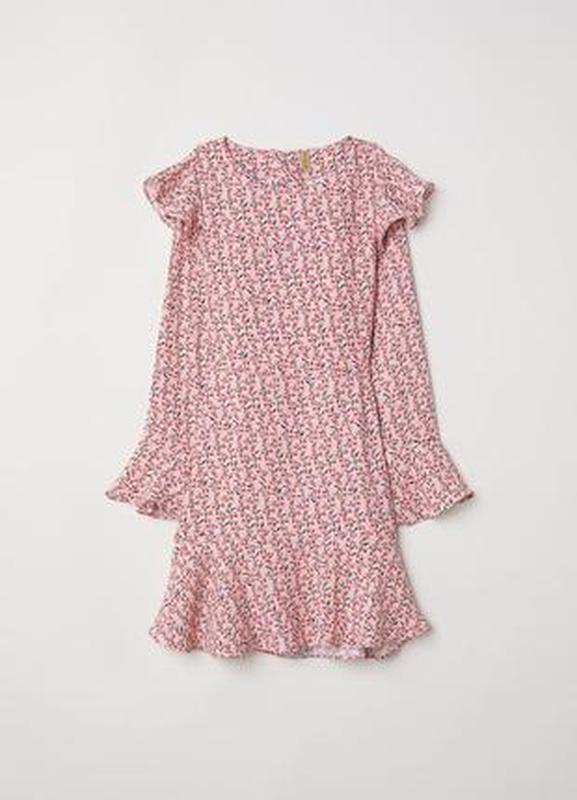 Короткое платье с оборками из уплотненной ткани, креп шифон, с рисунком и длинными рукавами, отрезное по резинке на талии сзади, открытая вставка сзади с оборкой по кругу и потайная застежка сзади сверху. Без подкладки. Новой товар в фабричной упаковке Состав Полиэстер 100% Замеры ПОГ 52 ПОТ 41 ПОБ 55,56 Длина 93 Рукав 65 и 70 Плечи 41-43