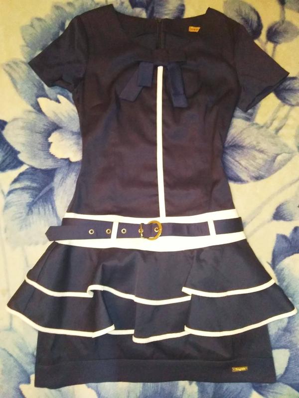 Платье короткое с баской и короткими рукавами. Бренд - Defile Lux. Производство - Турция. Размер - 38, подойдёт на S-M. Цвет - тёмно-синий с белым. Материал: вискоза - 75%, нейлон - 20%, эластан - 5%. Длина - 81 см, грудь - 38 см, талия - 32 см, бёдра - 44 см, ширина нижней юбки (по низу) - 46 см. Платье с кокетливой баской на пояске и прямой юбкой под ней, на груди - бант, застёгивается сзади на молнию. Состояние - идеальное, надето 1 раз.