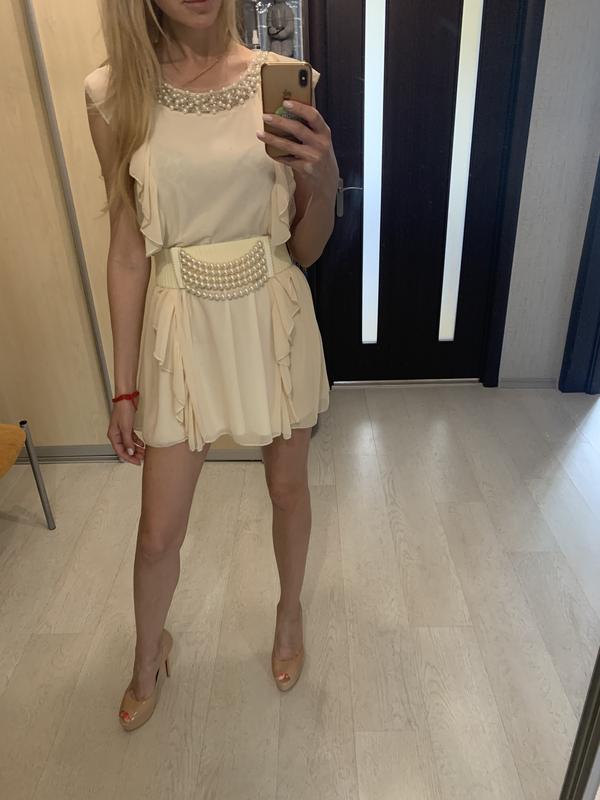 Нарядное шифоновое платье с поясом(на талии),с подкладкой.Горловина вышита бисером,бусинами.Красивый ванильный цвет. Можно носить как с поясом,так и без.Размер S.Выгуливалось раз. Состав: Шифон