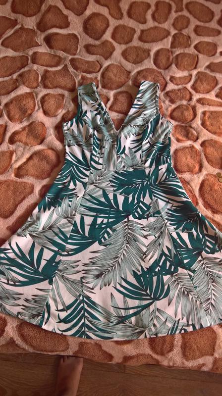 Актуальная платье в тропический принт. V-образный вырез спереди и сзади. Есть немного катышки, но не видно. длинна 88 талия 38 грудь 42