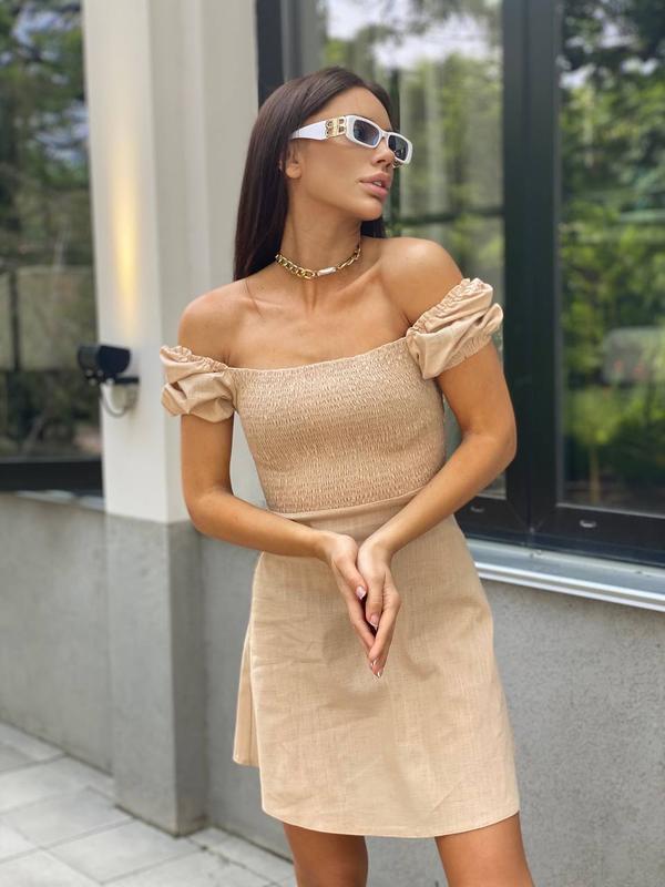 N 685 Платье из льна Верх собран на резинку Рукава фонарик на резиночке Размер:40-42,44-46 Состав : 55% лен 45% вискоза Замеры 40-42 Обьем груди за счет резинки до 95 см Талия до 67 см Бедра до 97 см Длина 83 см Рукав 25 см