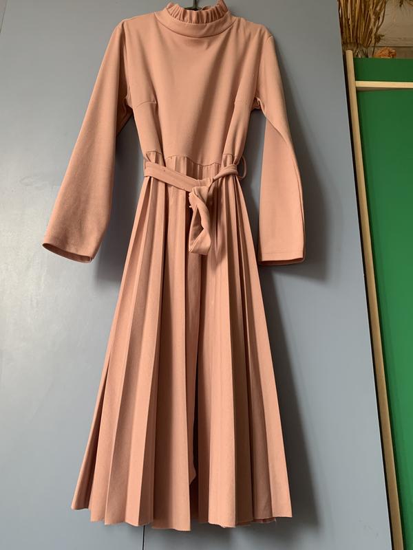 Красивое платье бледно розового цвета, с поясом. Можно завять и спереди и сзади. Рукав длинный, на воротнике нежные рюши. Длина по колено (при росте 170)