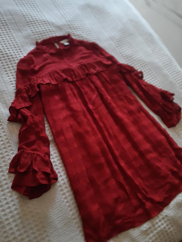 Платье H&M бардо Размер 38. Свободный крой, подойдет на размер S, M. На подкладке. Декор оборки. Сзади застежка пуговица. Длина 85 Длина рукава 60 Грудь 48 Плечи 40