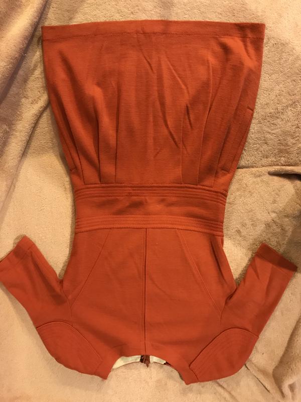 Очень красивое платье цвета тыквы. Красиво сидит по фигуре за счет широкого плотного пояса и юбки тюльпана. Очень стильные плечи. Сшито на заказ.