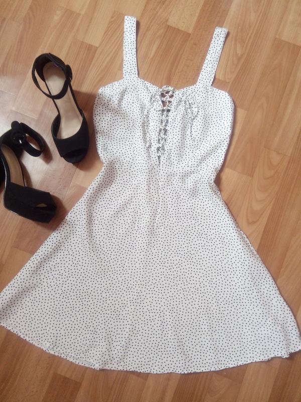 Белое платье в горошек на бретельках, спереди шнуровка на груди, сзаде молния