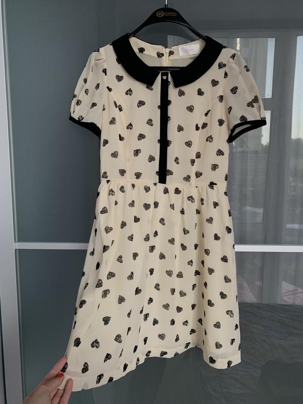 Легке платтячко з приємної тканини Ніжний принт в сердечка Є підклад,не просвічується Є тонкі лямки на талії для пояси Дуже легке,не парить в жарку погоду Надіто було 2 рази Розмір xs-s ,на зріст до 173 Орієнтуйтеся по замірах: Плечі 35 Груди 44 Рукав 20 Талія 35 Довжина по спинці 81