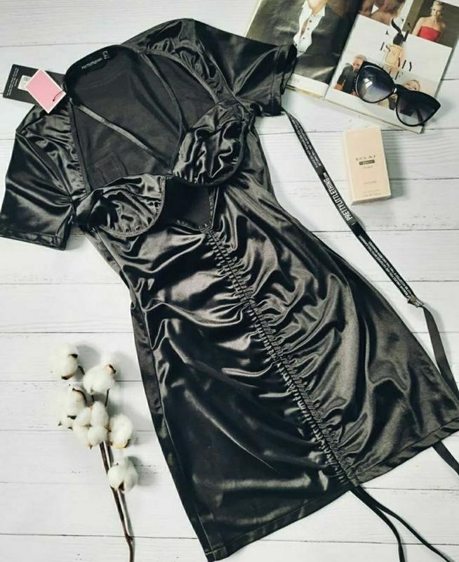 Эфектное атласное чёрное платье. Сбоку застегивается на молнию. Размер 12. Полуобхват груди - 38 см. Полуобхват талии - 34 см. Полуобхват бедер - 48 см. Длина - 83 см.